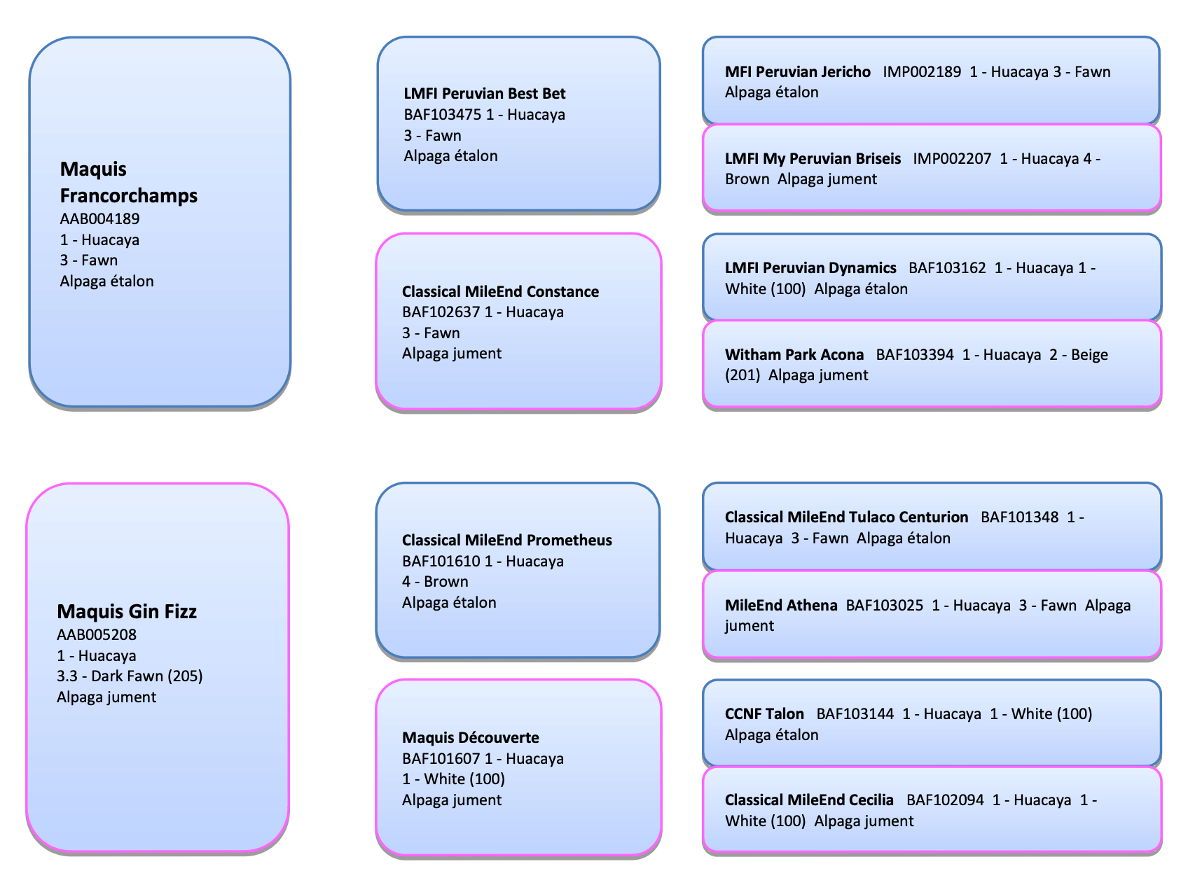Issu de notre meilleur mâle et d’une femelle figurant dans notre top 5, Izzogoud incarne à lui seul l’excellence génétique de notre élevage. Ce superbe alpaga Huacaya de couleur Beige (201), né le 18 août 2019, possède un pedigree prestigieux. Son père, Francorchamps, et sa mère, Gin Fizz, comptent parmi les plus grands noms de la filière européenne, tout comme ses grands-parents et arrière-grands-parents, tous primés à l’échelle internationale.